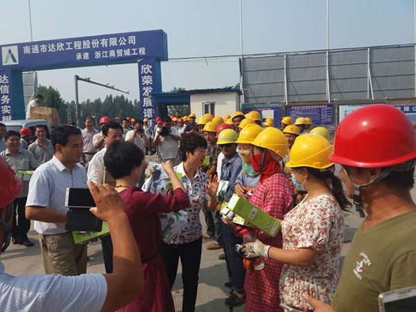7月6日,第三、第十工程公司承建的邯鄲商貿城項目,迎來了邯鄲市委、市政府、市總工會組成的慰問團。慰問團一行向奮戰在施工一線的廣大干部職工發放了夏季慰問品??偣飨诂F場發表了熱情洋溢的講話,高度贊譽達欣是一支過硬善戰的施工隊伍,并勉勵全體參戰人員鼓足干勁,保證工程按期封頂,按期交工。