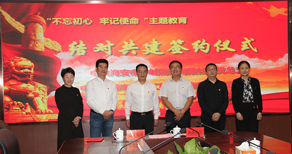 集團黨委根據“不忘初心  牢記使命”主題教育的部署,10月12日在集團總部與海安市中城街道海陵社區黨總支完成結對共建簽約儀式。中城街道新陵辦事處黨委書記周海冰、政工書記唐濤、海陵社區黨總支書記劉海燕、集團黨委書記劉厚純、黨委宣傳委員杭小建等出席簽約儀式。
