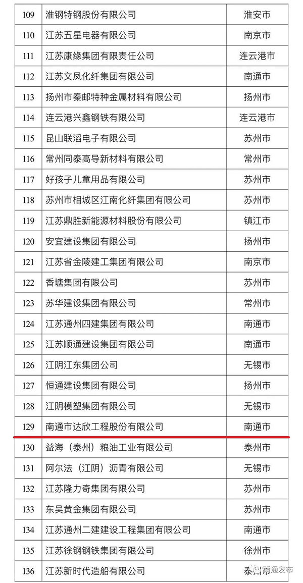 9月21日,由江蘇省工商聯發布的最新民營企業200強名單出爐。達欣集團首次入圍,排位129位。本次南通民企入圍總數為32家,海安建筑企業3家。