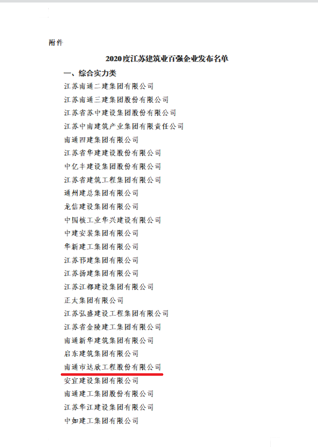 江蘇省住房城鄉建設廳、江蘇省統計局、江蘇省商務廳聯合發布2020年度全省建筑業“百強企業”名單,南通市達欣工程股份有限公司以卓有成效的業績連續七年榮登百強企業榜單,綜合實力類排名第22名。