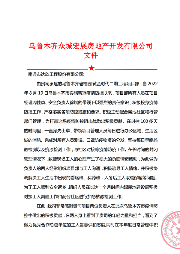 1月10日,集團公司收到來自烏魯木齊眾城宏展房地產開發有限公司的一封表揚信,信中對集團第十一公司烏魯木齊碧桂園·黃金時代二期工程項目部,自2022年8月10日烏魯木齊市實施新冠疫情防控以來,項目部全體人員在疫情防控和項目建設中表現出的責任與擔當表示感謝。內容詳見附件: