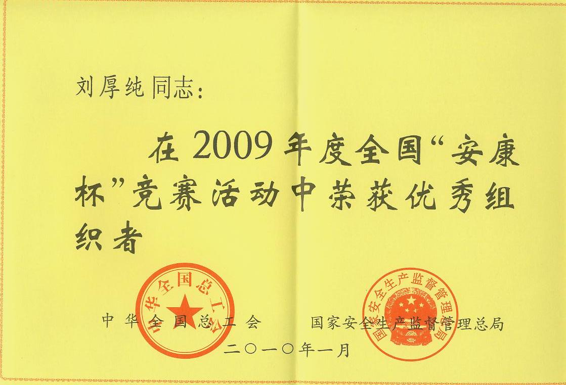 中華全國總工會、國家安全生產監督管理總局聯合發文,公司黨委書記、副董事長劉厚純獲得2009年度全國“安康杯”競賽活動優秀組織者稱號。
