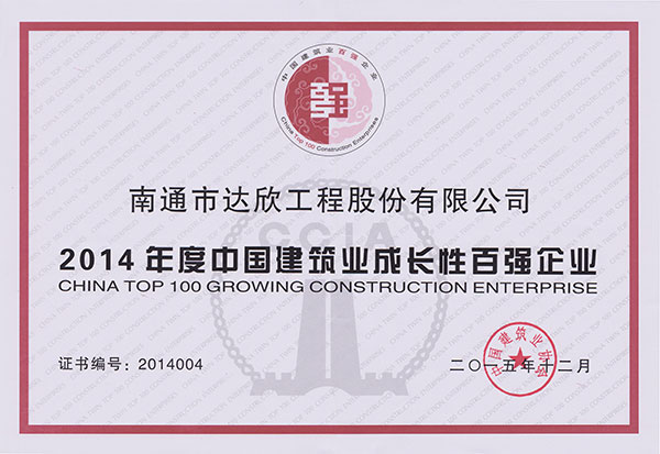 ----公司榮獲2014年度中國建筑業成長性百強企業