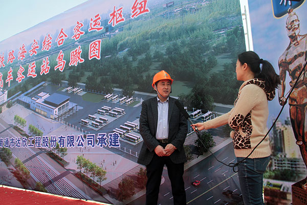 在開工儀式后,馬董事長現場接受了海安電視臺的采訪,代表公司向全縣人民承諾,要把本項目作為公司的重點工程、形象工程展示給全縣人民,做到抓質量精益求精,抓進度一絲不茍,抓安全防微杜漸,以一流的素質,一流的服務,一流的技術,打造出優質的精品工程回饋家鄉人民。